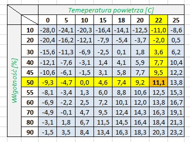 Ogólnie mówi się, że optymalny punkt rosy wynosi od około 4 do 16 stopni. Wtedy możemy bez obaw stosować humektanty. Moje włosy jednak uważają 16 stopni za zbyt wysoką wartość. Optymalnie jest u mnie od 4 tak do 14 ;) Wartość poniżej 4 - niska wilgotność, wartość powyżej 16 - wysoka wilgotność. Latem często punkt rosy dochodzi do 21-22 stopni. Zimą są to niskie wartości, często nawet ujemne. Zerknijcie sobie na tabelkę wklejoną powyżej.